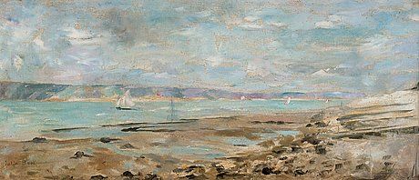 Franskt kustlandskap med segelbåtar.