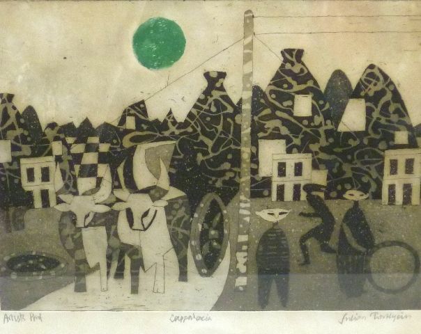 An Artist's Proof of stylised figures and oxen under a green sun titled Cappalacia