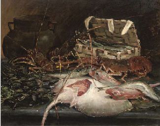 A skate, lobsters, mussels and other fish by a basket and an urn