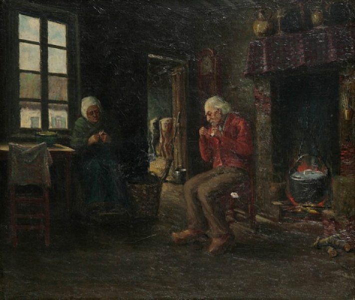Boereninterieur met pijprokende man en uien-pellende vrouw