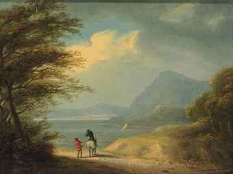 | A coastal landscape with a horseman and a traveller on a path in the foreground | |