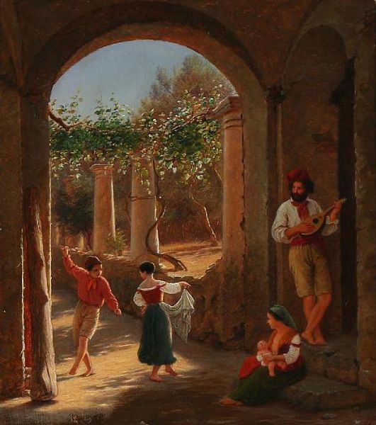 | A Neapolitan is playing the mandolin while a couple of children are dancing | |