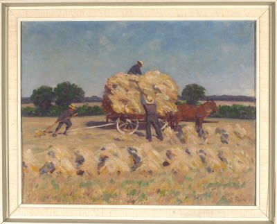 Getreideernte - Drei Bauern mit Pferdewagen auf dem Feld