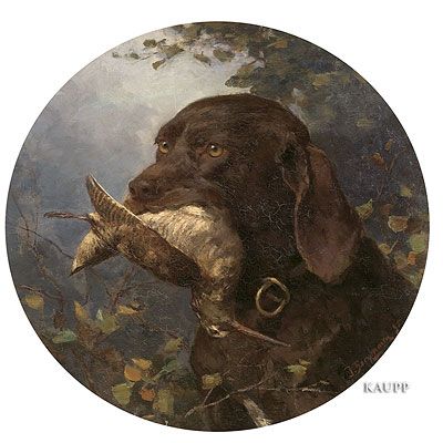 Im Tondo Jagdhund, eine Schnepfe im Maul tragend
