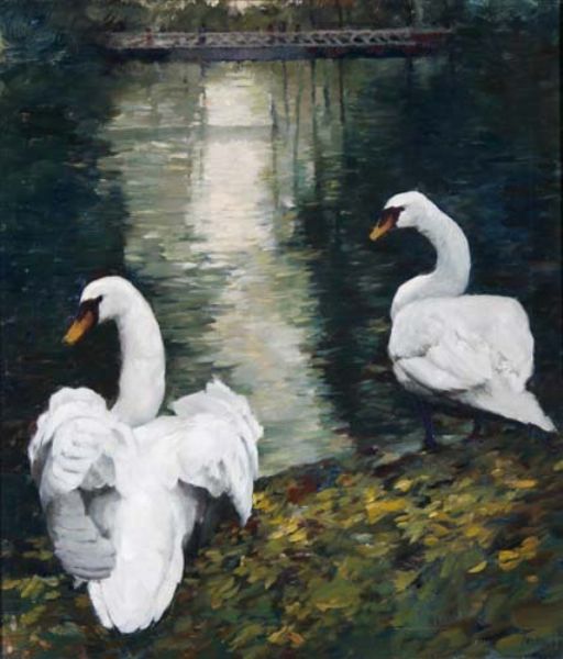 Zwei Schwäne am Ufer eines Sees