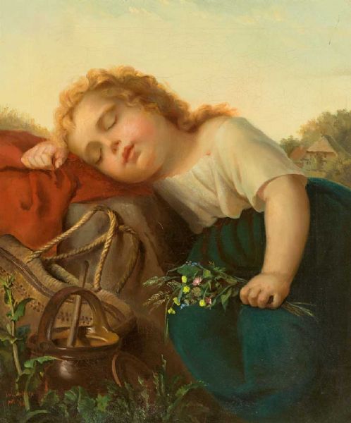 Schlafendes Kind mit Blumenstrauß, im Hintergrund reetgedecktes Gehöft.