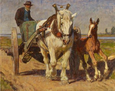 Bauer mit Pferdekarren und Fohlen am Niederrhein.