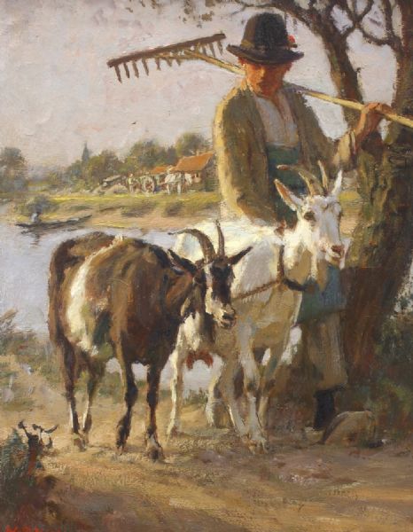 Junger Mann mit zwei Ziegen in einer Flußlandschaft
