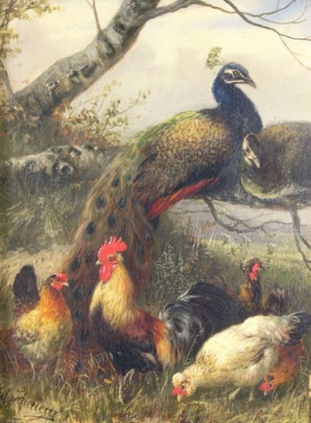 COCKEREL AND HENS WITH PEACOCKS AND A PEAHEN
