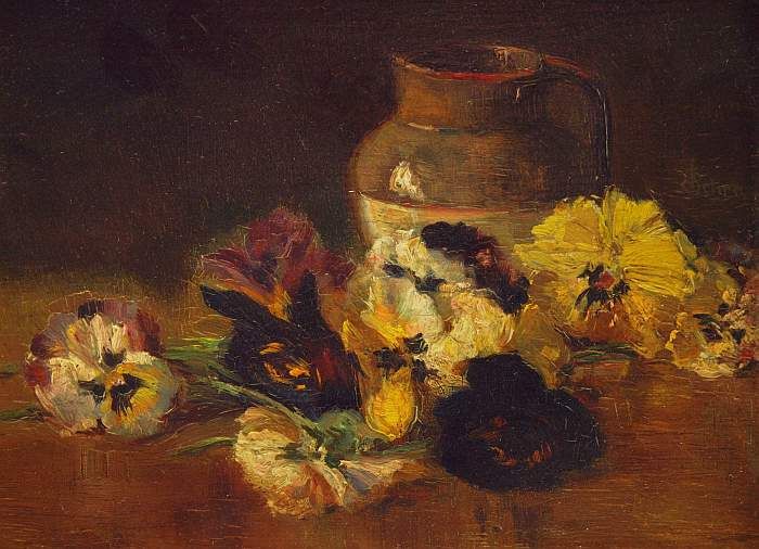 Blumenstilleben "Tag und Nacht". Gedeckter Tisch mit Krug und Stiefmütterchen