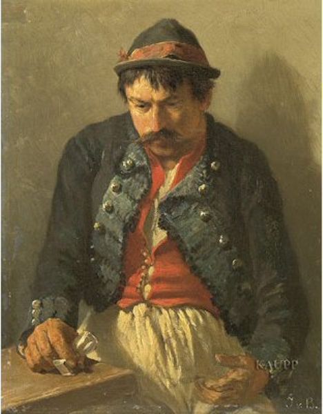 | An einem Tisch sitzender Mann in Tracht, in seiner rechten Hand ein Likörglas haltend | |