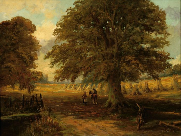 Een landschap met korenschoven en reizigers onder schaduw van een eik