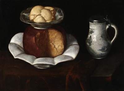 Stilleben mit Käselaib und Humpen sowie einer Schale Brot