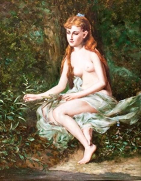 Nymph gathering flowers by a pond