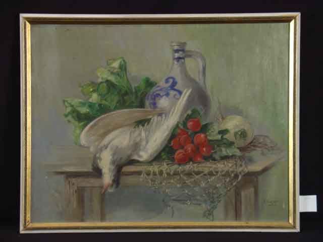 Küchenstillleben mit Weinkaraffe, Gemüse, Salat und Taube