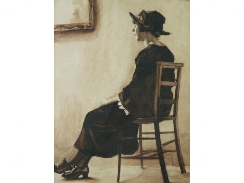 | Portrait of a seated lady wearing a hat, gazing out of a window | |