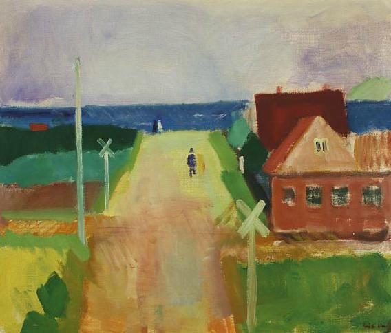 | Landscape with houses and railway, in the background view over the sea | |