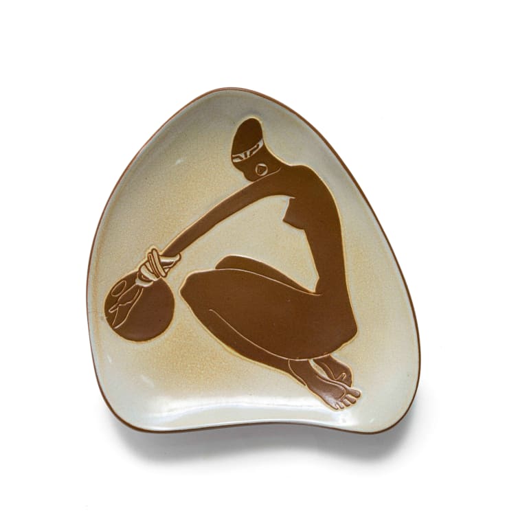 Organic-shaped dish decorated with a figure wearing headband and bangles