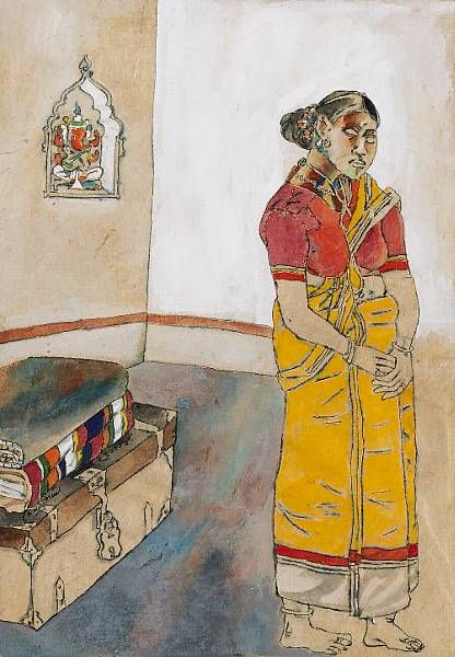 Woman with trunks in a room before a statue of Ganesha