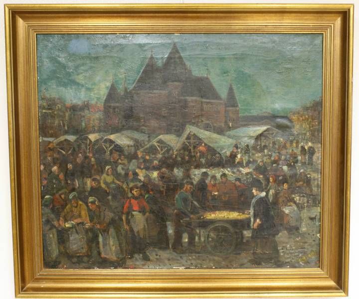 Drukke marktdag bij De Waag op de Nieuwmarkt te Amsterdam