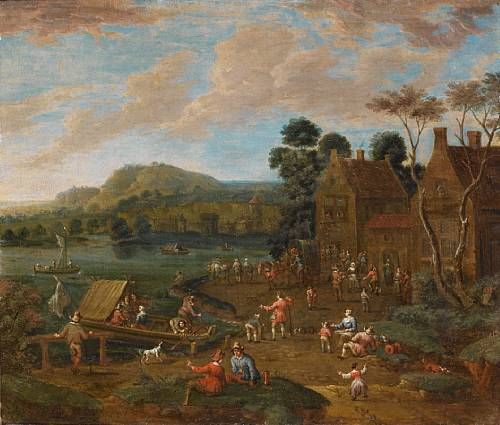 | An extensive river landscape with figures dancing and playing music before a village; and A river landscape with figures departi | |