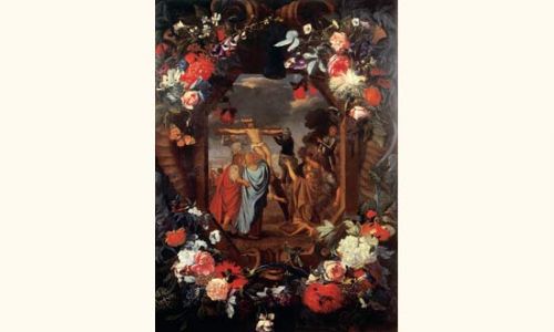 L'érection de la Croix dans un cartouche décoré de fleurs