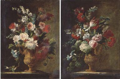 | Carnations, morning glory, marigolds, roses and other flowers in a sculpted urn on a stone ledge; and Carnations, morning glory, | |