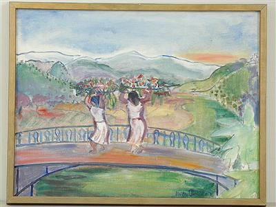 Sydländskt landscape with kvinnor on bro.