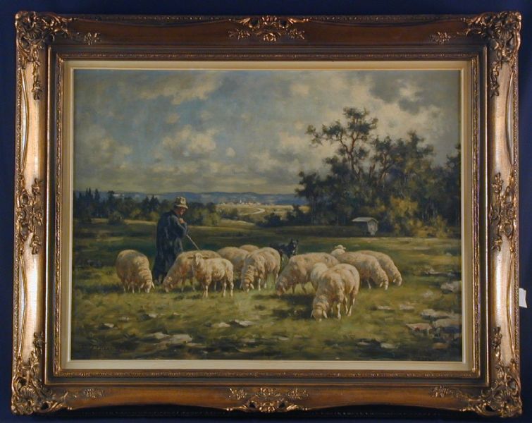 Schafherde mit Hirte und Hund, vor schwäbischer Landschaft