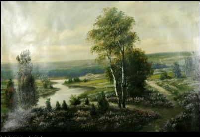 Weite Flusslandschaft mit Bäumen und Gehöft