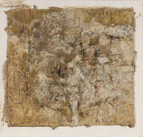 | Gouache and color chalk over collage on white -bordered hard fiber board, firmly laminated on canvas coated board. | |