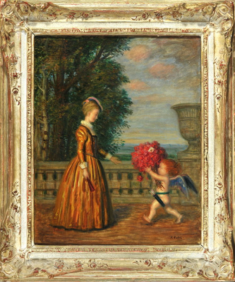 Amor überreicht Dame einen Strauß roter Rosen