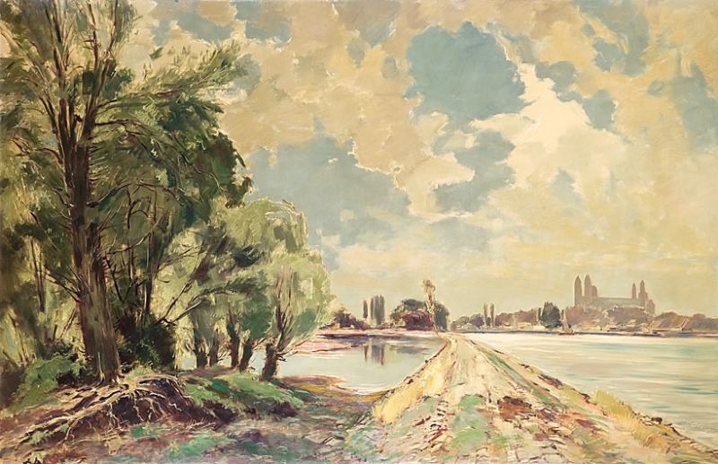 Der Kaiserdom am Rhein. Silhouette des Doms von Speyer am Rheinufer