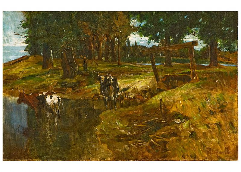 ühe in seichtem Wasser und Hütejungen unter Bäumen