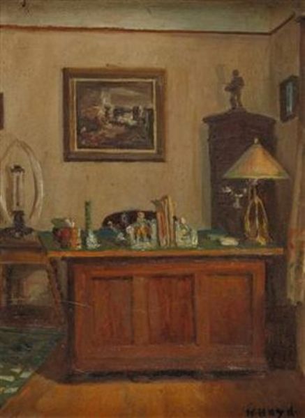 Rückseite mit altem Klebezettel, Betitelt "Zimmerecke mit Schreibtisch"
