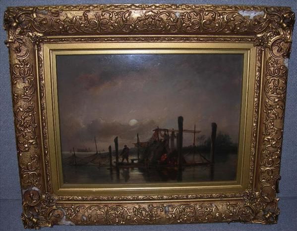 Figures sorting nets on a pontoon by moonlight