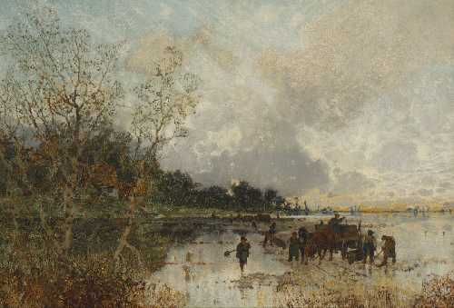 Pferdefuhrwerke mit Arbeitern am Ufer
