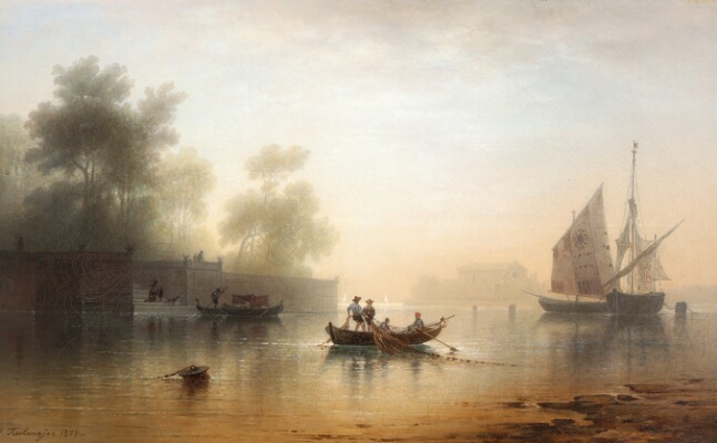 Scenery with a gondola and fishing boats, presumably from Venice