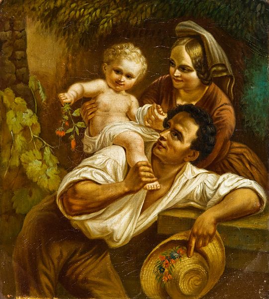 | Die Winzerfamilie . Kleinkind auf der Schulter des Vaters sitzend, von der Mutter gehalten | |