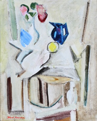 Still life with blue jug and lemons