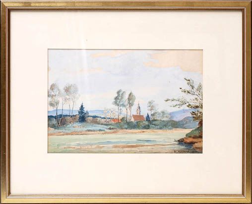 Blick auf ein kleines Dorf in den Voralpen unter sommerlichem Himmel.