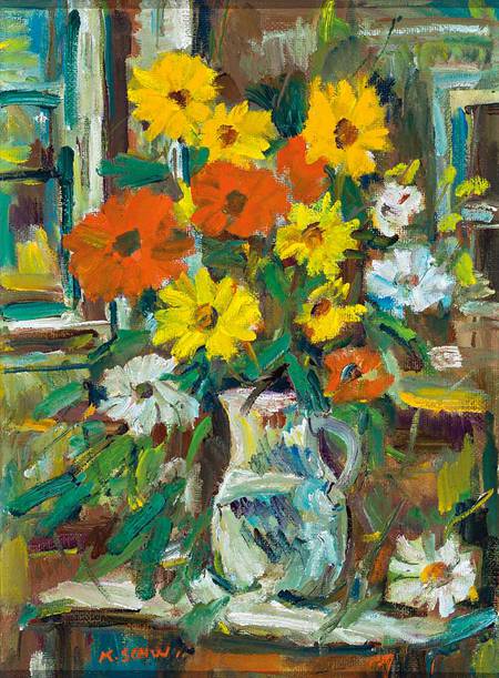 Bunter Blumenstrauß mit Margeriten in gläsernem Krug