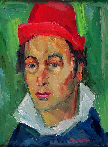 | Portrait eines jungen Mannes mit rotem Hut als Schulterstück vor grün changierendem Hintergrund | |