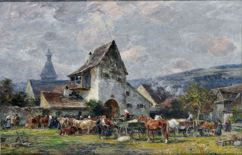 | Lebhaftes Treiben auf dem Viehmarkt vor den Toren einer kleinen Kreisstadt an einem herbstlichen Tag | |