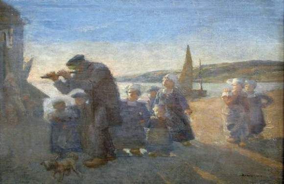 | Flandrische Hafenlandschaft, am Ufer Kinder, einem Flötenspieler mit Hund nachlaufend | |