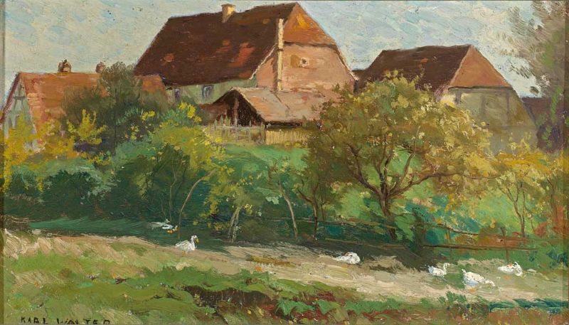 Blick auf ein Gehöft, im Vordergrund Gänseschar