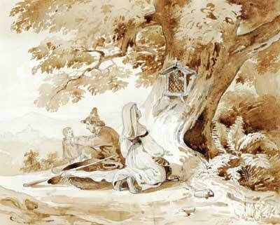 | Italian peasants praying at a wayside shrine, distant view of Rome beyond | |