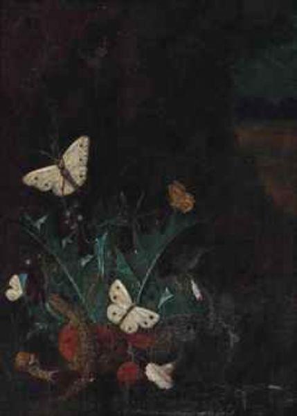 | A forest floor still life with a salamander, a snail and cabbage white butterflies | |