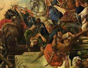 Schlachtenszene mit orientalisch gekleideten Reitern auf einer hölzernen Brücke