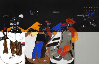 “Mænd & Ænder” (Men & Ducks), 2002. Signed, titled and dated on the reverse. Mixed media on eight pieces of paper. Overall sheet size 136×206 cm. | |